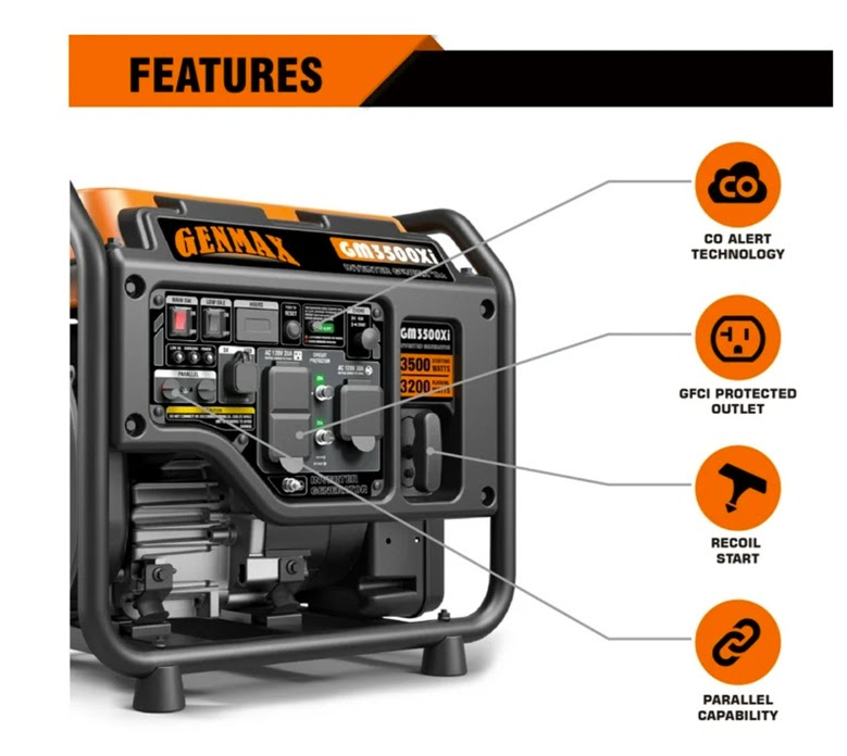 GENMAX 3500 Peak Watts-Gas Powered Open Frame RV Ready Inverter Generator,Quiet Technology, EPA Compliant GM3500Xi