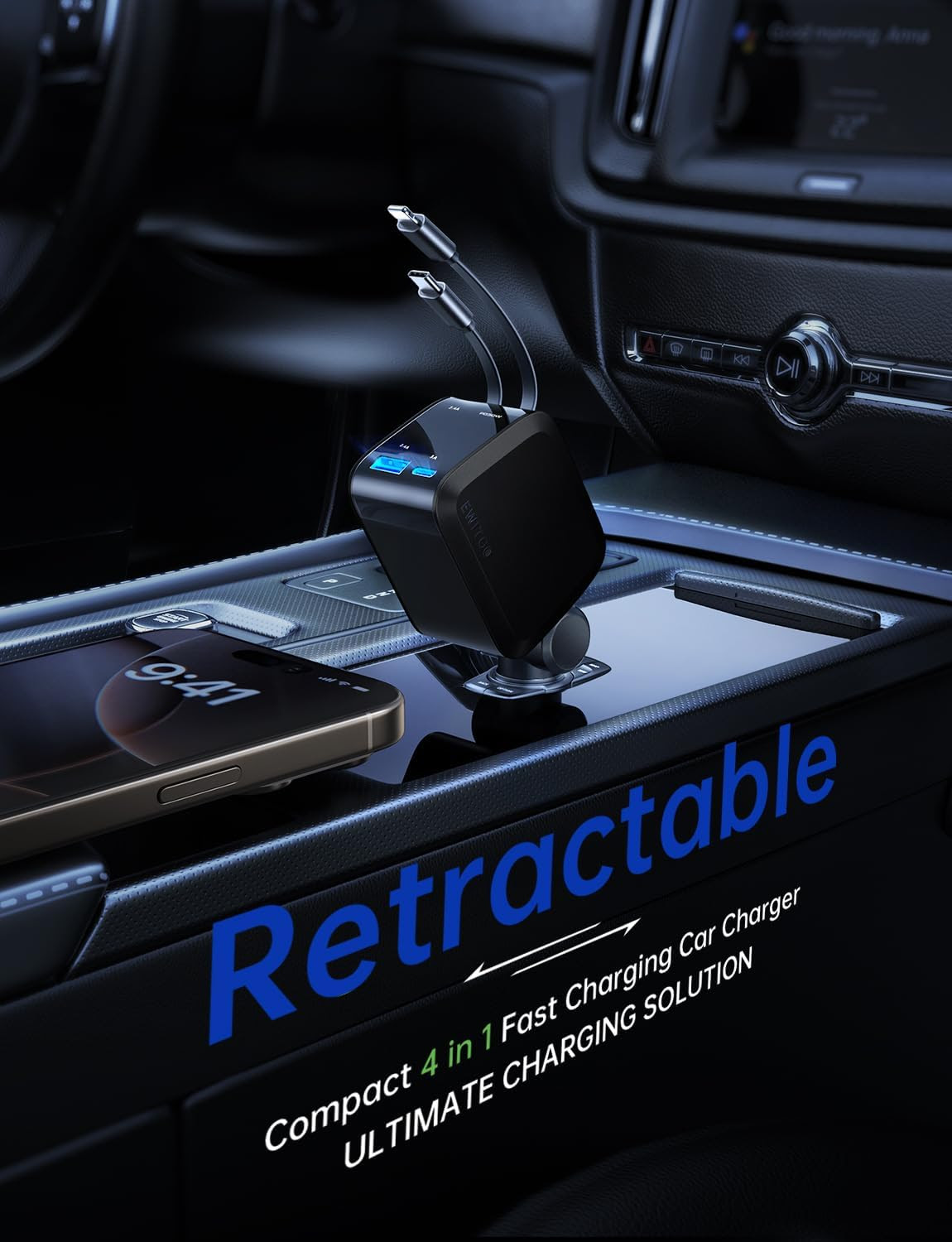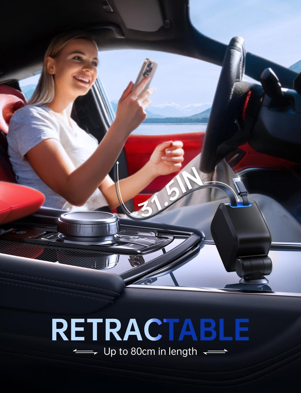 Retractable Car Charger, Car Accessories, 69W Fast Charging USB C Car Charger with 4FT Retractable Cables and 2 Ports, for iPhone 16 15 14 13 12, Samsung etc Black