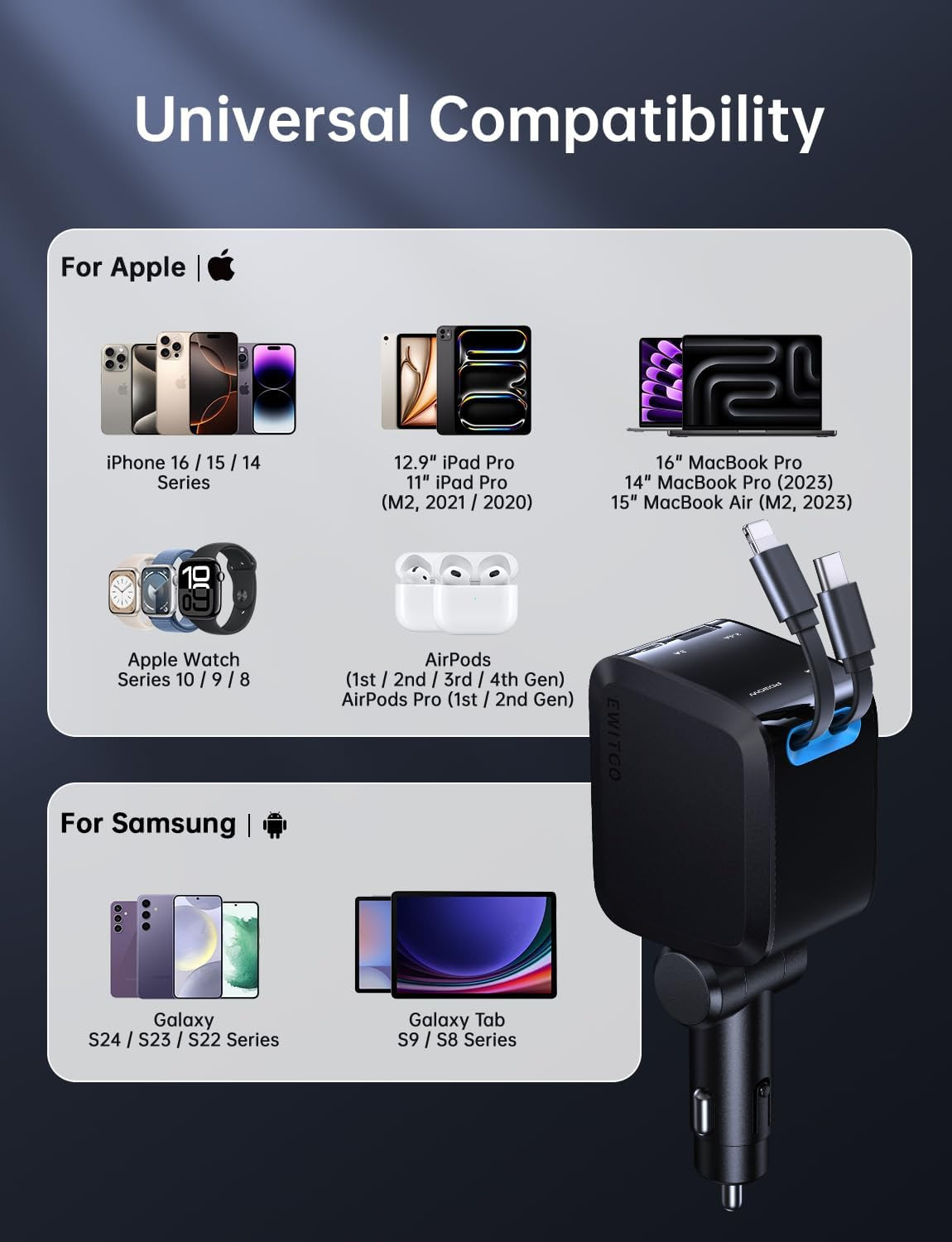 69W Fast Charging USB C Car Charger with 4FT Retractable Cables and 2 Ports. 10,587 Units. EXW New Jersey $10.95 Unit. Retail $99.99