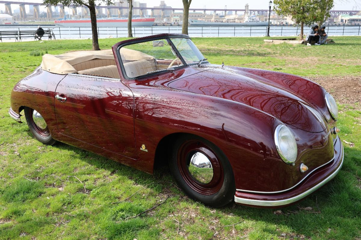 One of only 156 Reutter-bodied Cabriolets made in 1951, this very early Pre-A 356 Cabriolet, features a split windscreen and body-to-bumper styling and is finished in the original color Pascha Red (523) with a Tan cloth top, boot cover, and Tan interior. Completed on September 8, 1951, and first delivered to Buenos Aires, Argentina, this Pre-A remained in South America until purchased by a German collector in the 1980s. The 356 has since been restored several times over the years, each time to a very high standard, first in 1990 and again recently. European Collectibles has recently rebuilt the top end of the engine, sorted out the shifter mechanism, and the braking system was also rebuilt. The 356 is well-prepared for top-down touring, rallies, or competition on the Concour events.