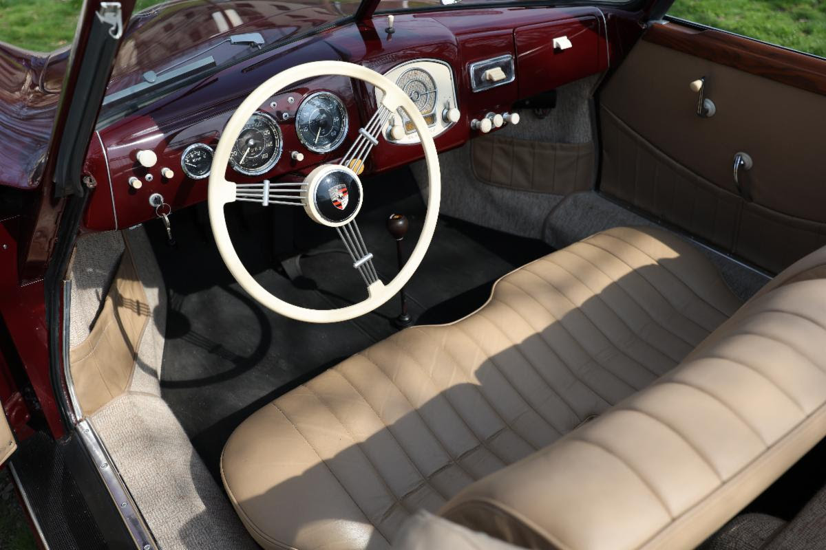 The body was built by Reutter, a coachbuilder that was purchased by Porsche in 1963. Pascha Red is the original factory color and was offered from 1951 to 1953. Its dark cherry red exterior is complemented by a split windshield, with its prominent central crease, distinctly uncluttered, pure design, Excelsior 5.0/5.25-16 tires, body color steel wheels with chrome hubcaps, and body-to-bumper.