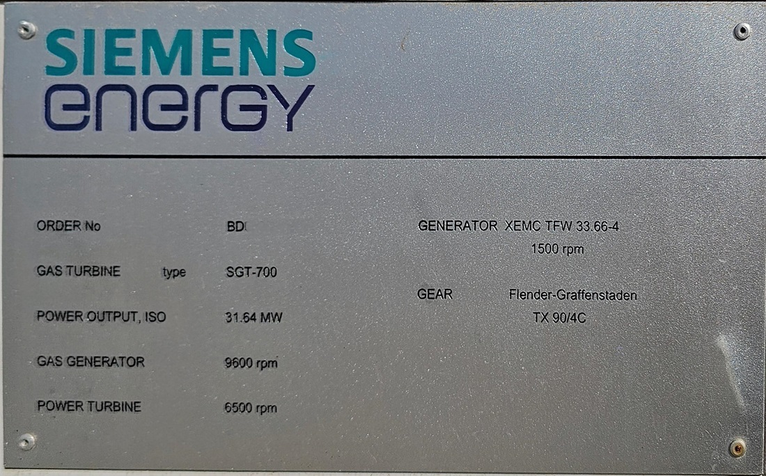 2.1 1 No Siemens SGT 700 Gas Turbine YOM 2019/2020 33.6 MW , 50 Hz