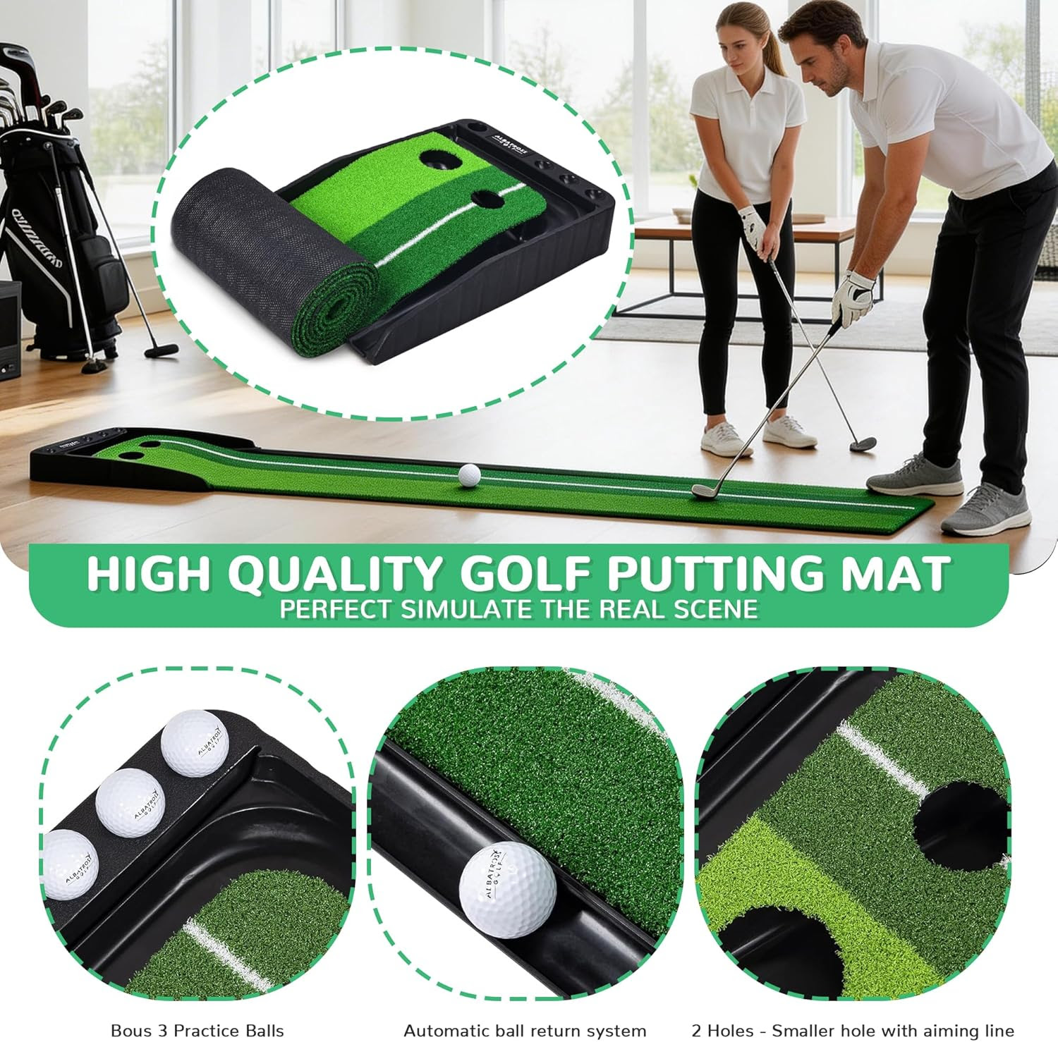 Fitvids Premium Automatic Ball Return Golf Putting Mat, Portable Indoor Golf Practice Green with Alignment Guide & Solid Base, Ideal for Home or Office and Golfers,