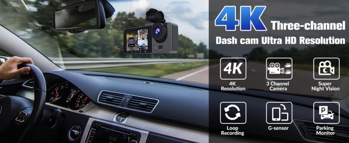 4K Full UHD 3 Channel Dash Cam:3 channel camera can record video up to Full UHD 4K( 3840*2160P) on the front and 1080P on the rear, Offering a 170° front camera, a 120° built-in camera and a 150° rear camera, it can simultaneously monitor the front, rear and interior of the vehicle to maximize road coverage, greatly enhance night vision and provide clear and crisp images and videos. The dashcam is a combination of front, rear, and interior cameras.
