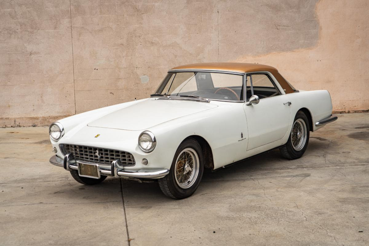 250 PF s/n 01315 GT retains its original, numbers-matching engine, trans and diff and is accompanied by a rare, original and mostly complete leather tool roll with its tools, jack and lube gun plus an original 250 GT owner’s manual. 250 PF s/n 01315 GT has just completed a full rebuild of the brakes hydraulic systems and a carb tune by Chris Dugan at Dugan Enterprises, Oceanside Cal. As per Chris Dugan (an FCA Enzo-era judge) the car is wonderfully complete with every original part other than a modern fuel pump. The engine runs well and is nicely tuned, the oil pressure is great, the trans nicely “clicks” through the gears and the rebuilt brake system hauls it down from speed. All the gauges work, the mechanics are well sorted and while it is not perfect, it is a study in ready-to-use patina, a pleasure to own and drive to a Sunday brunch or a weekend Cars and Coffee meet. A wonderful find in its largely unrestored condition, all numbers matching, this early Ferrari is a unique prize for the astute collector.