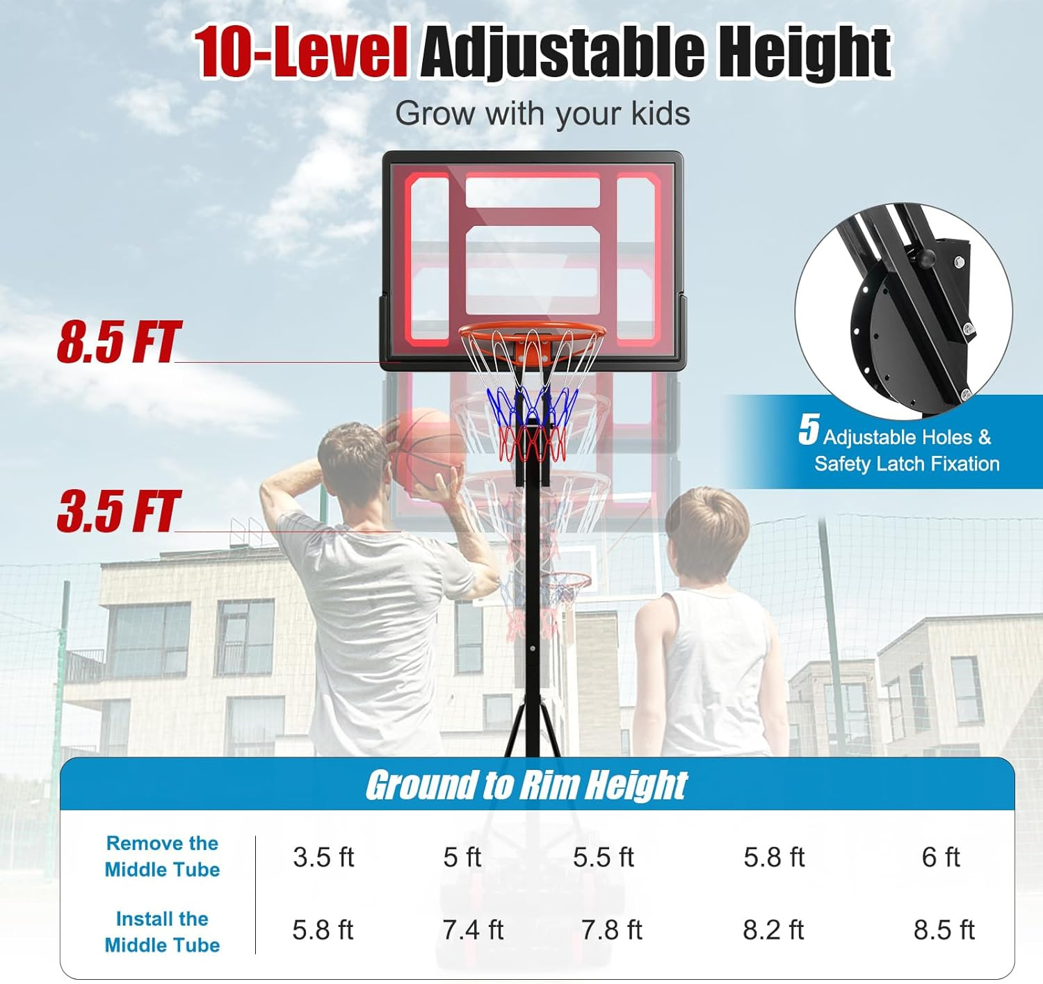 GYMAX Portable Basketball Hoop, 5 FT to 10 FT Adjustable Basketball Goal with 10 Heights, All Weather Basketball Stand System with Weight Bag & Wheels, for Kids Youth Adult, Indoor Outdoor Pool, Court