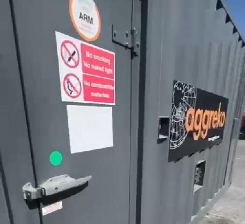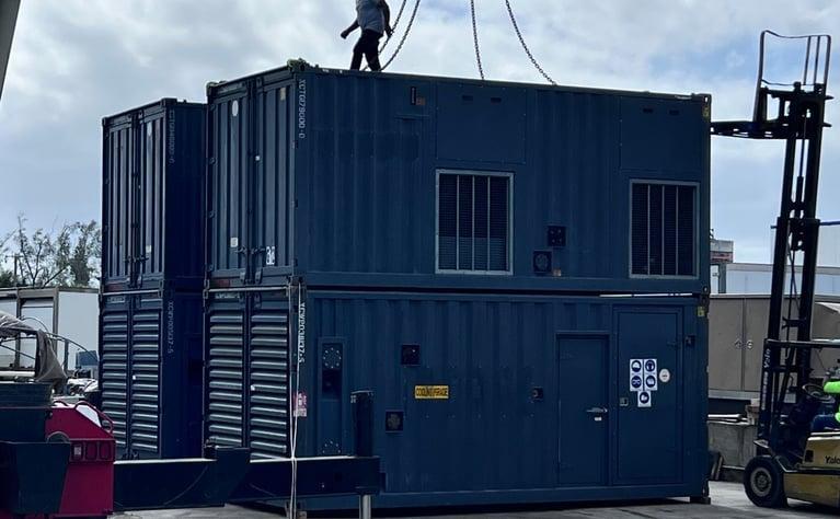 The generator is a gas engine-driven alternator with control electronics, mounted on a bedplate and housed within a custom-built 20ft stackable container.