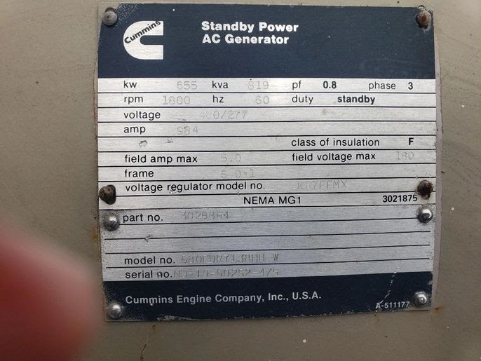 655KW Diesel Standby Skid Mounted Generator 277/480V - 60Hz - 838 Hours - Digital Controls - Hospital Take Out!