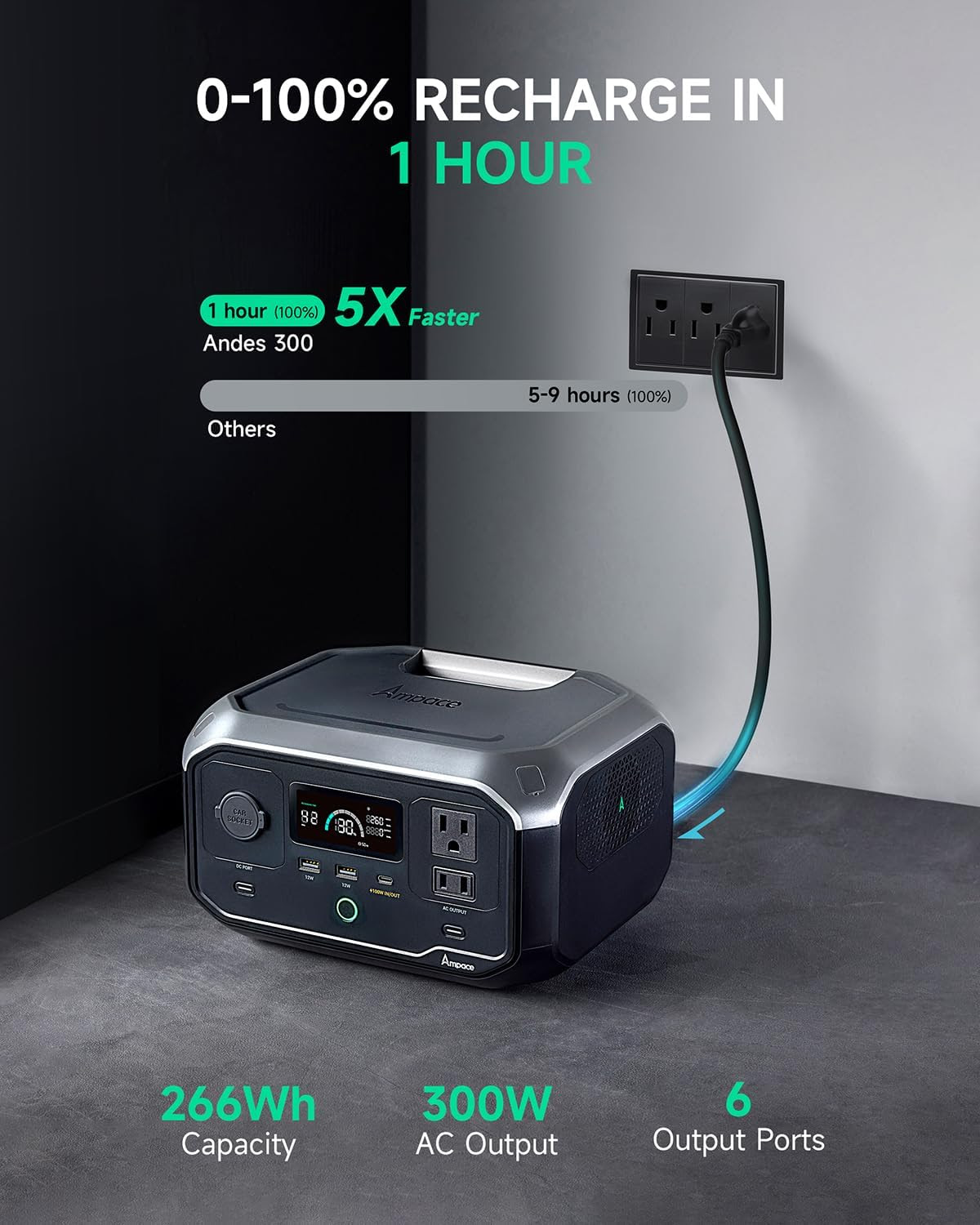 Portable Power Station Andes 300 with 100W Solar Panel, 266Wh Battery with 300W AC Output, 1Hr Fast Charging, 8.2lbs Solar Generator for RV, Outdoors, Camping, Traveling, and Emergencies.