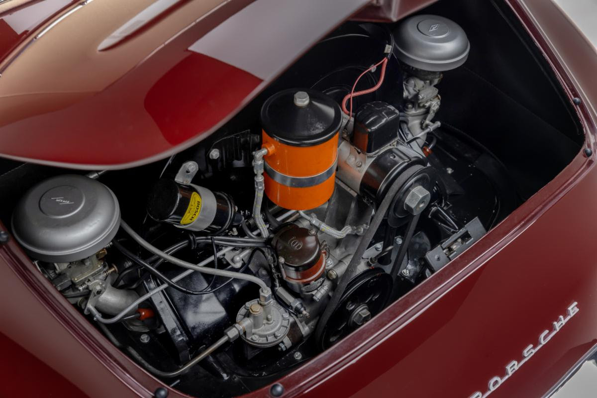 The body was built by Reutter, a coachbuilder that was purchased by Porsche in 1963. Pascha Red is the original factory color and was offered from 1951 to 1953. Its dark cherry red exterior is complemented by a split windshield, with its prominent central crease, distinctly uncluttered, pure design, Excelsior 5.0/5.25-16 tires, body color steel wheels with chrome hubcaps, and body-to-bumper.