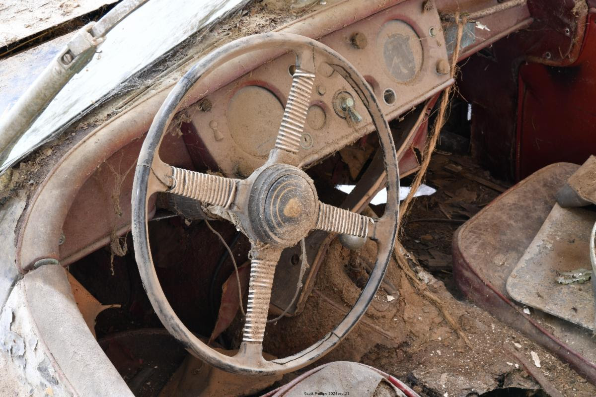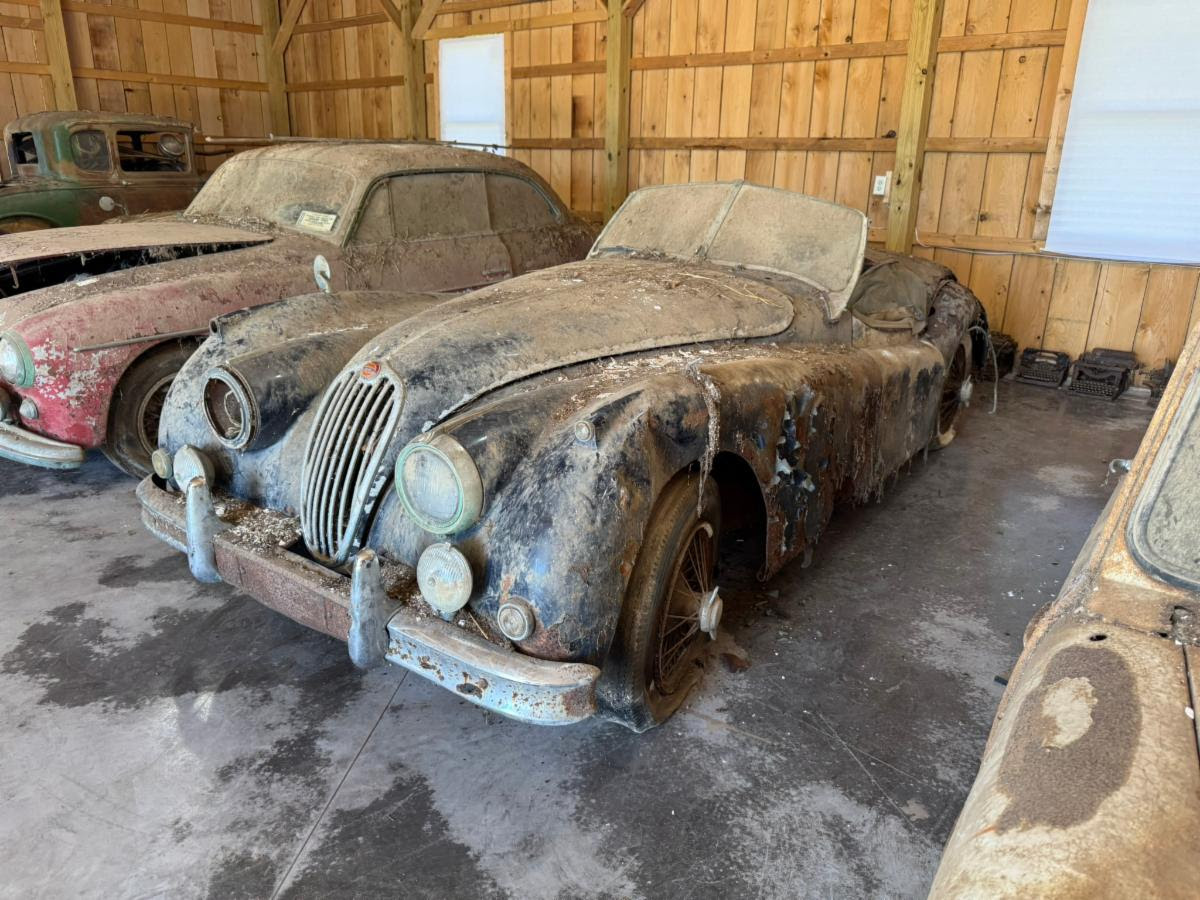 This 1956 Jaguar XK140 Roadster is a true barn-discovery out of a large estate collection and a highly sought-after MC model with matching numbers. Blue with red leather interior. An extremely original example thats gone untouched for decades and is now in need of a well-deserved complete restoration. It has rust but remains intact. This Jaguar is among the desirable Special Equipment or “SE” models, as denoted by the “S” prefix to the chassis number. This example was also fitted with the optional C-Type cylinder head, which increased engine power. Approximately 2,028 left-hand-drive XK140 Roadsters were factory equipped with both the SE package and C-Type head, a combination often referred to as the “MC” model. Given its relatively limited production numbers, ideal factory specification, and eligibility for some of the most popular driving events and concours, this XK140 MC Roadster represents an exciting opportunity for the enthusiast looking for a worthy and rewarding restoration project.